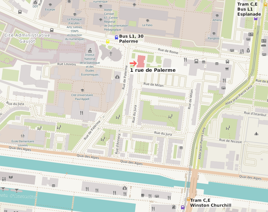 Bus 1 ou 30 arrêt Palerme ou tram Esplanade ou Winston Churchill / Bus G arrêt Presqu’île Malraux